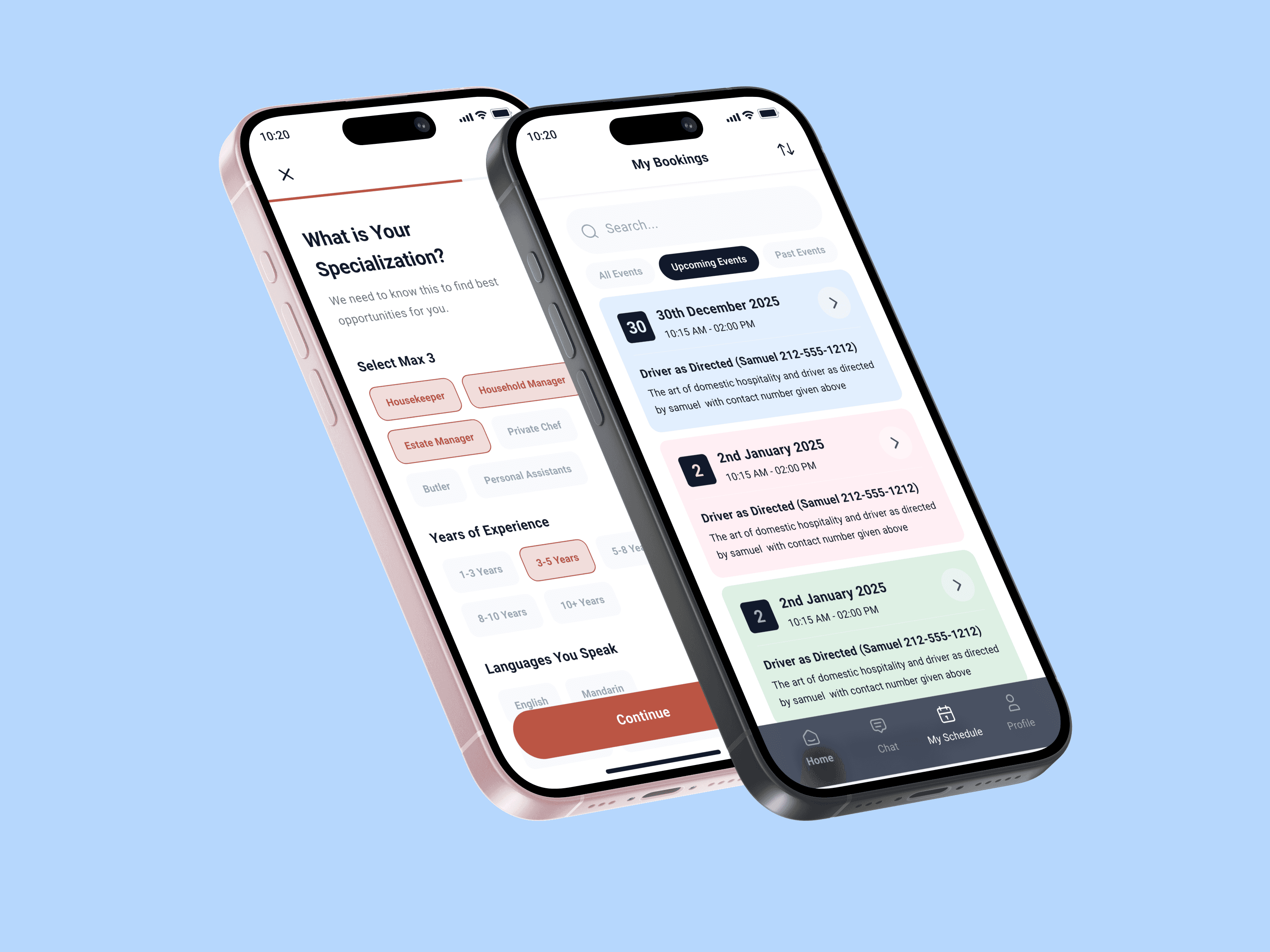 I focused on creating a calm, elegant interface that feels personal rather than transactional. Key decisions included a minimal color palette aligned with luxury branding, clear separation between core flows (Bookings, Chat, Profile), and content-first layouts that surface what matters most to users—upcoming events, travel details, and conversations. The booking experience was structured to handle multi-day, multi-location events with attachments and notes, while the in-app chat was designed as a central communication layer to reduce reliance on calls and emails.